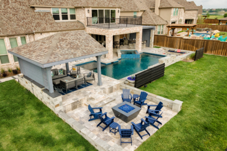 This straight line complete back yard make over was made for social gatherings and parties with friends. It features a tanning ledge, sheer descents, fire pit, in-pool bar stools, and a gorgeous raised spa.